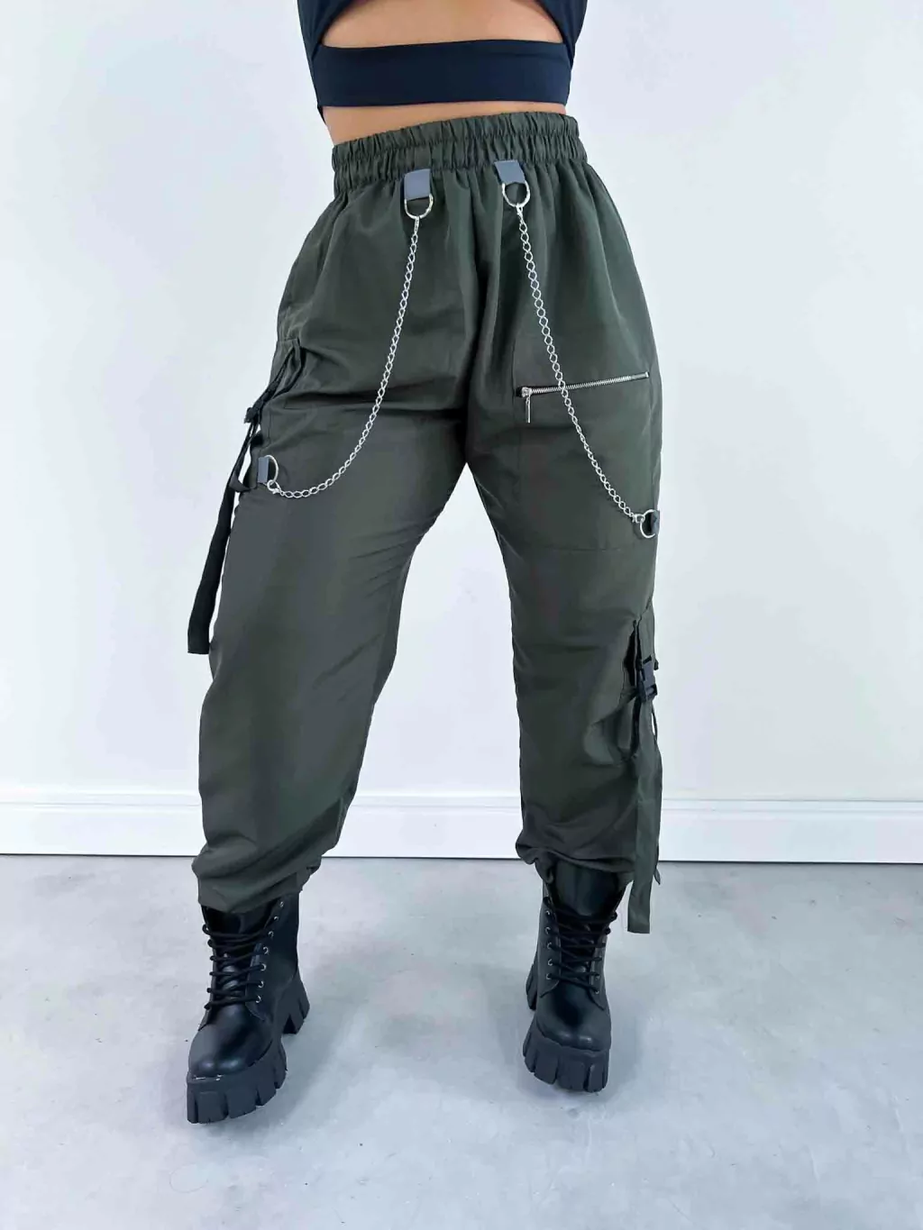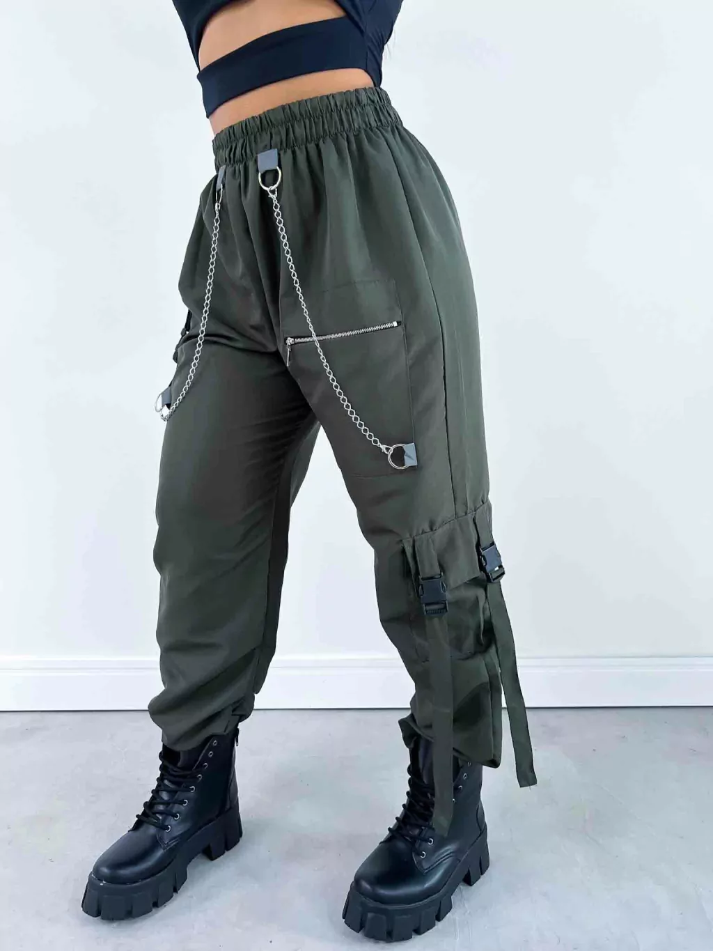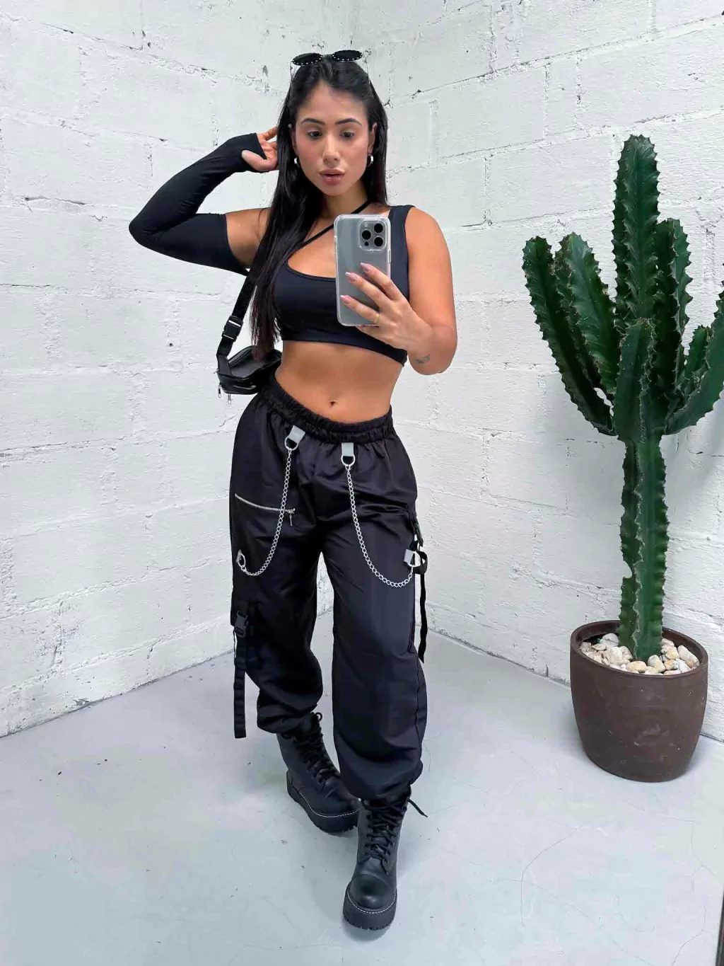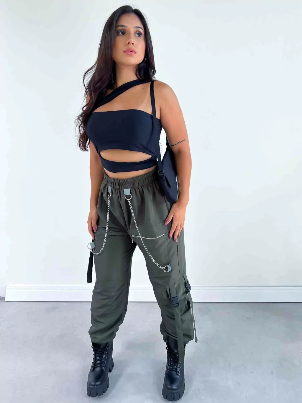 Com uma pegada gringa com bolsos laterais cargo, bolso frontal com zíper - o que permite