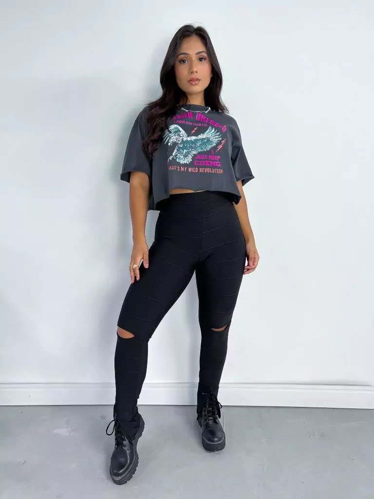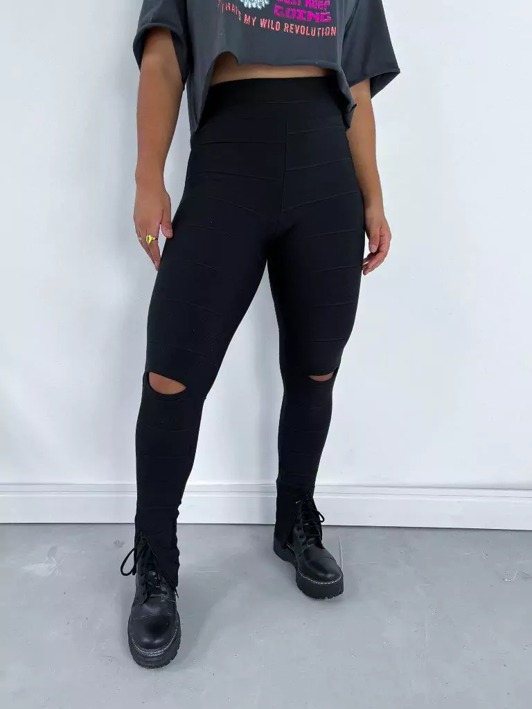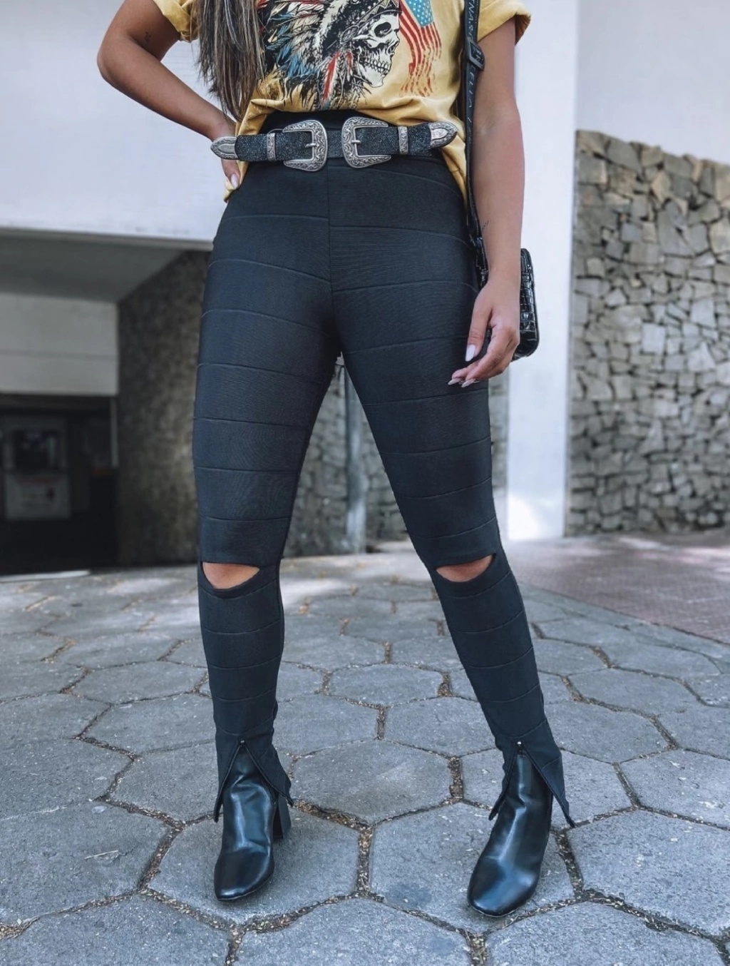 Calça legging em bandagem 100% poliester com recorte no joelho zíper na barra.