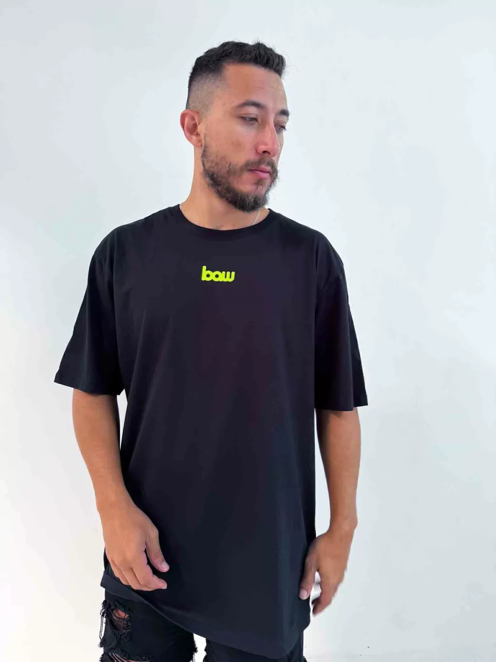 • O Modelo na foto tem 1,79 Altura e 76Kg e esta vestindo a camiseta da Baw no tamanho M