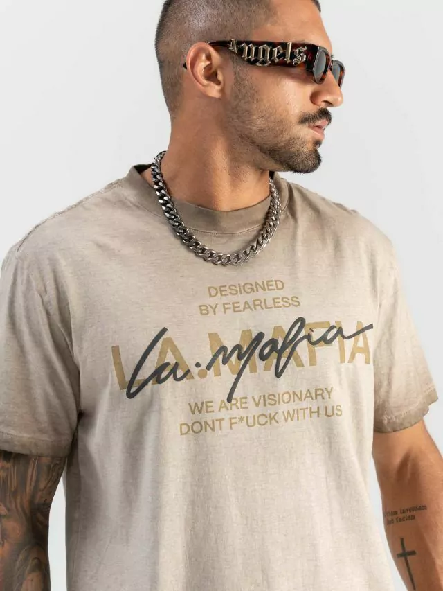 O Modelo na foto tem 1,79 Altura e 76Kg e esta vestindo a camiseta da la mafia clothing no tamanho M