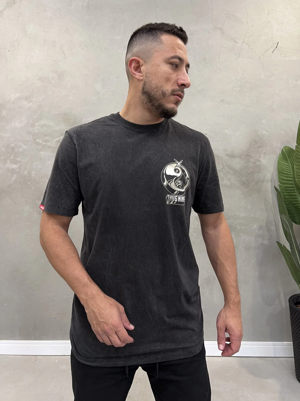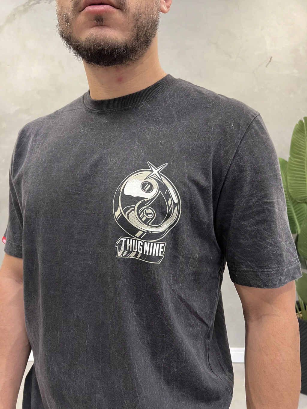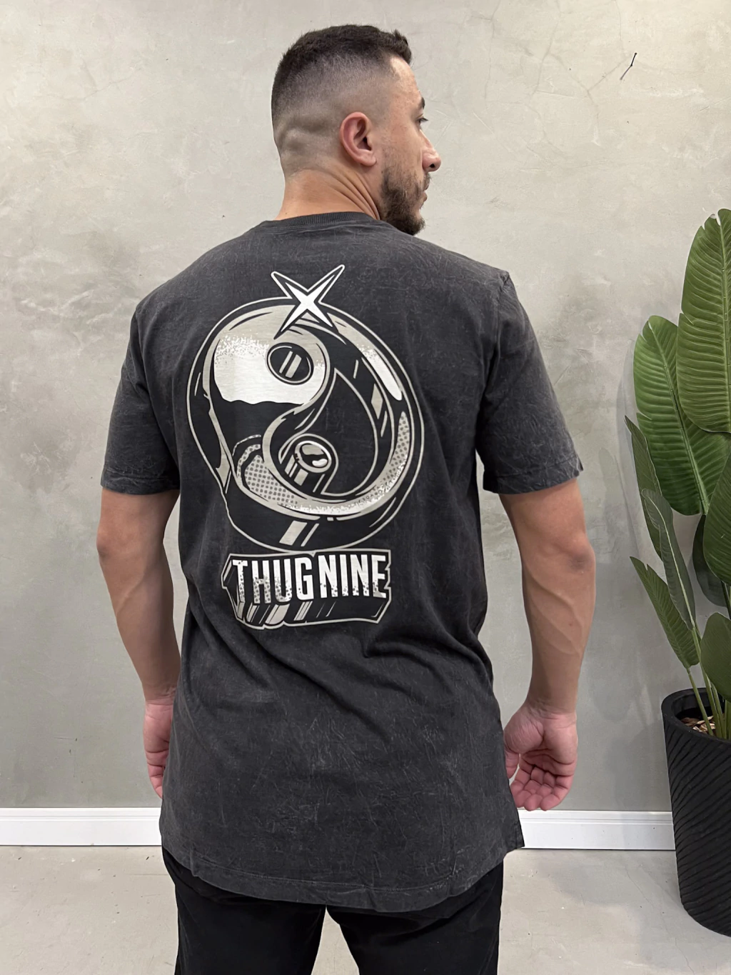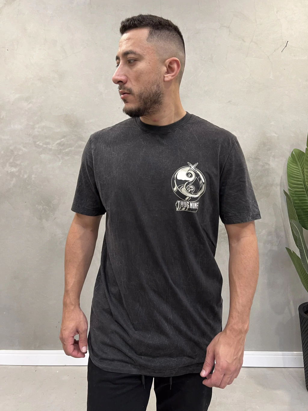 • O Modelo na foto tem 1,79 Altura e 76Kg e esta vestindo a camiseta da thug nine no tamanho M