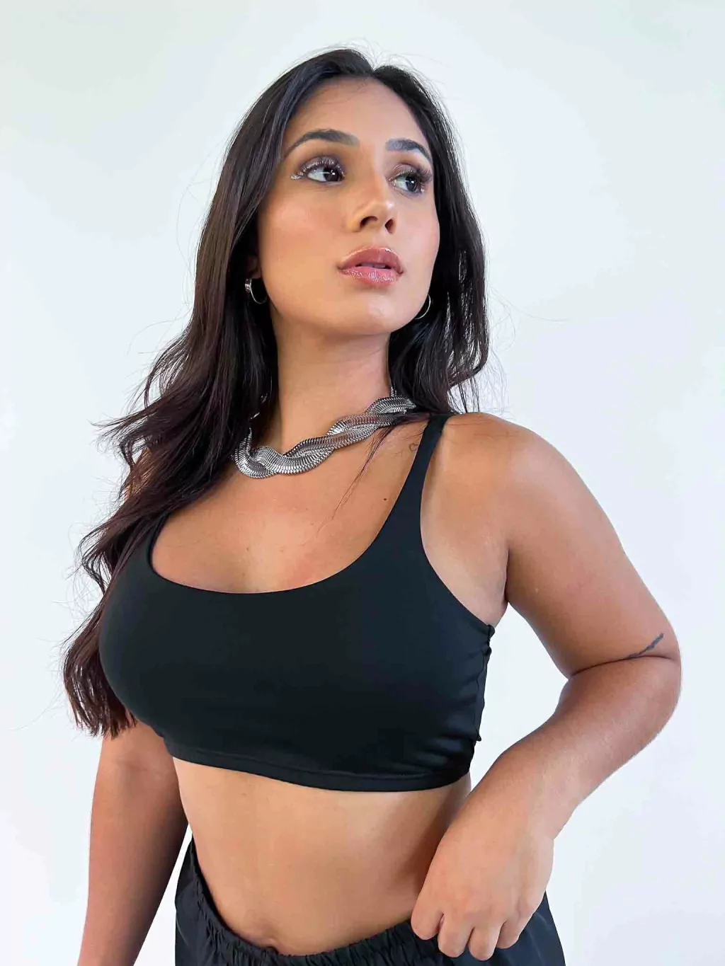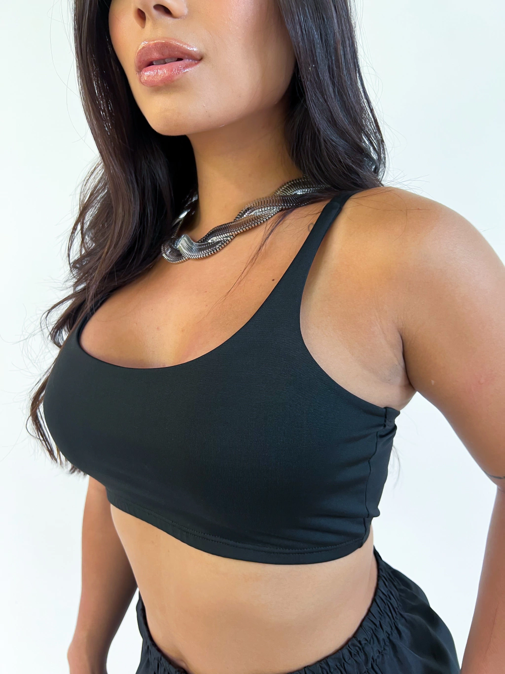 Esse top preto feminino de alça fina é perfeito para compor desde os looks básicos até os mais estilosos e despojados. Com modelagem ajustada ao corpo, ele oferece sustentação, conforto e versatilidade.
