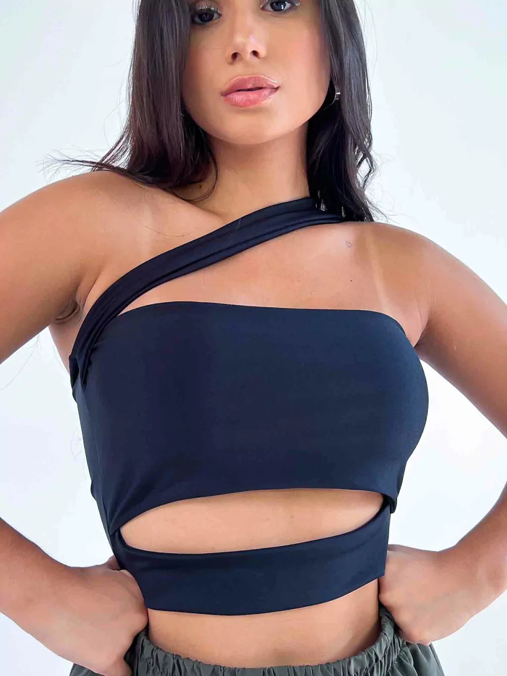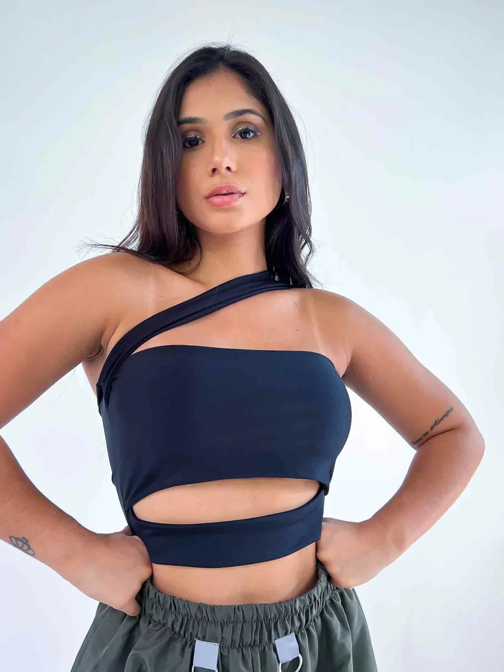 Cropped assimétrico Bia, a peça que falatava pra você.