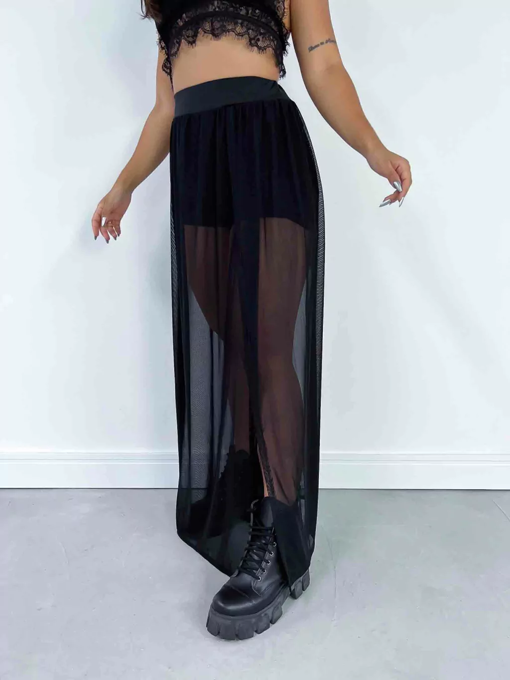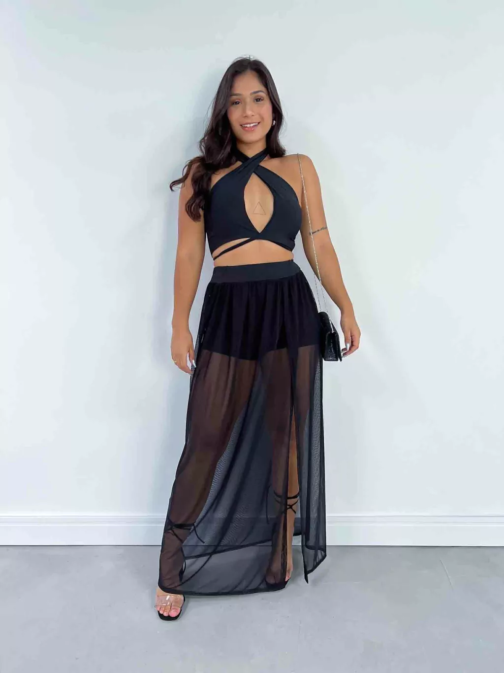 Com um design sofisticado, ela conta com uma fenda lateral que traz um toque de sensualidade discreto, sem perder a classe. O short embutido oferece praticidade, garantindo maior liberdade de movimento e conforto durante o uso. Versátil, pode ser combinado tanto com blusas casuais quanto com peças mais formais, adaptando-se a diferentes graças. Seu tecido de tule adiciona fluidez ao visual, criando um efeito atraente e delicado. Ideal para eventos especiais ou até mesmo para um look casual-chique no dia a dia.