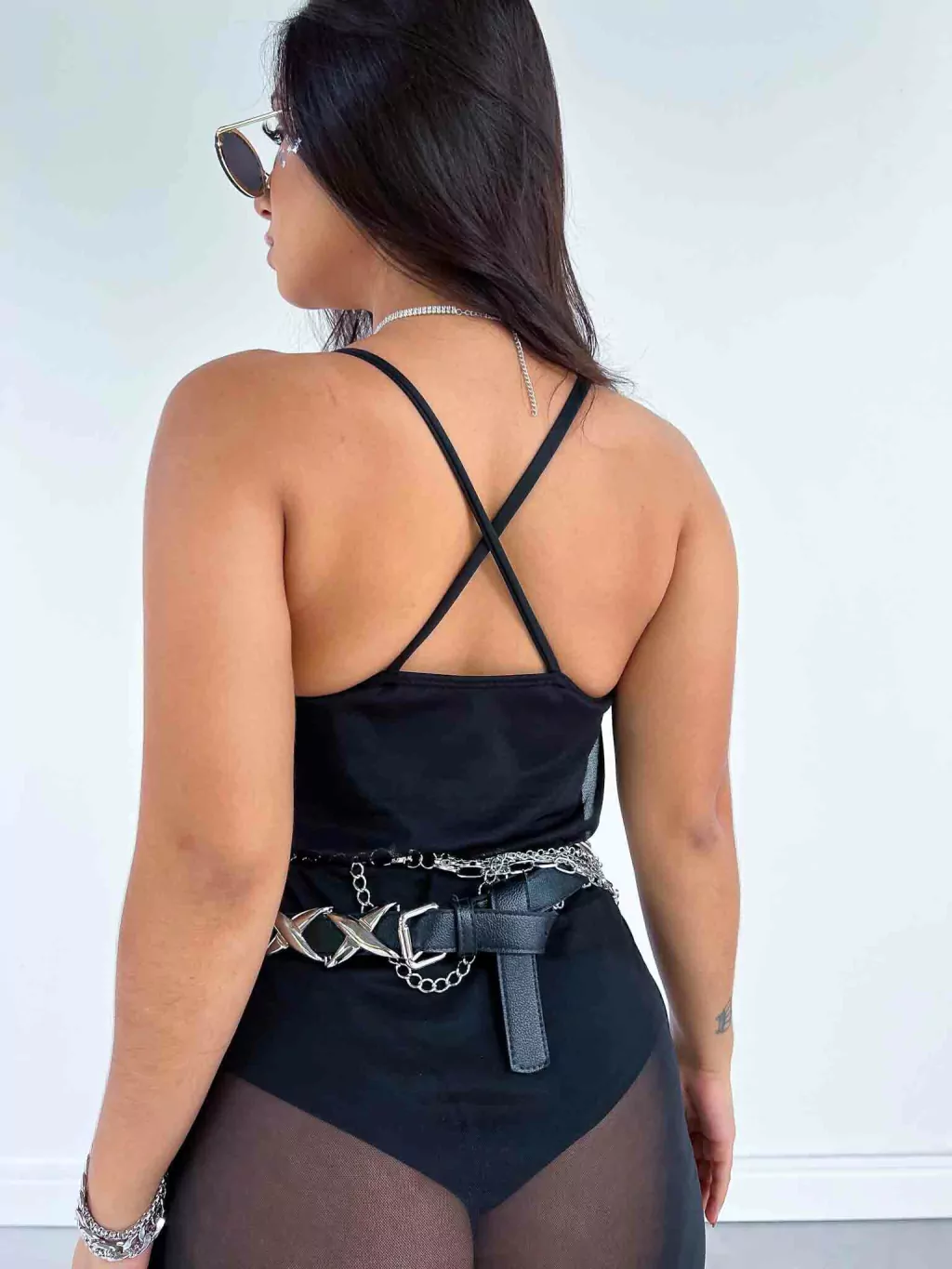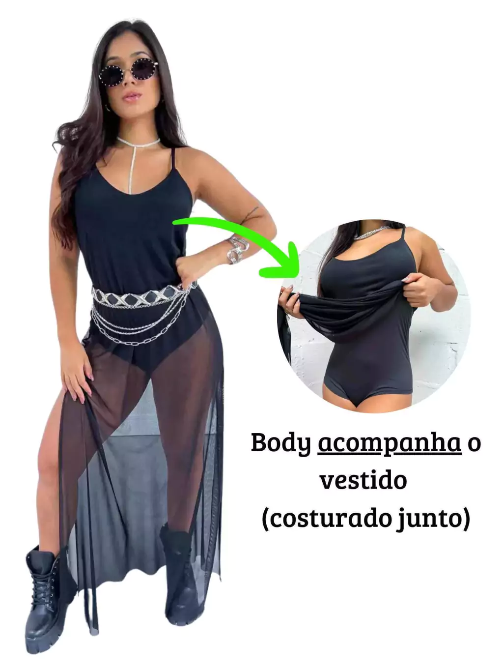 O modelo dele é perfeito, um body com vestido de tule embutido.