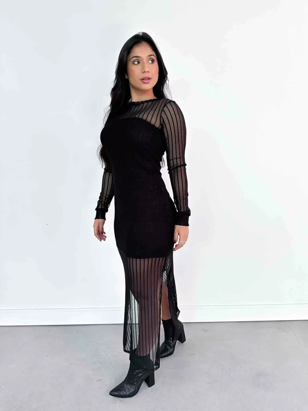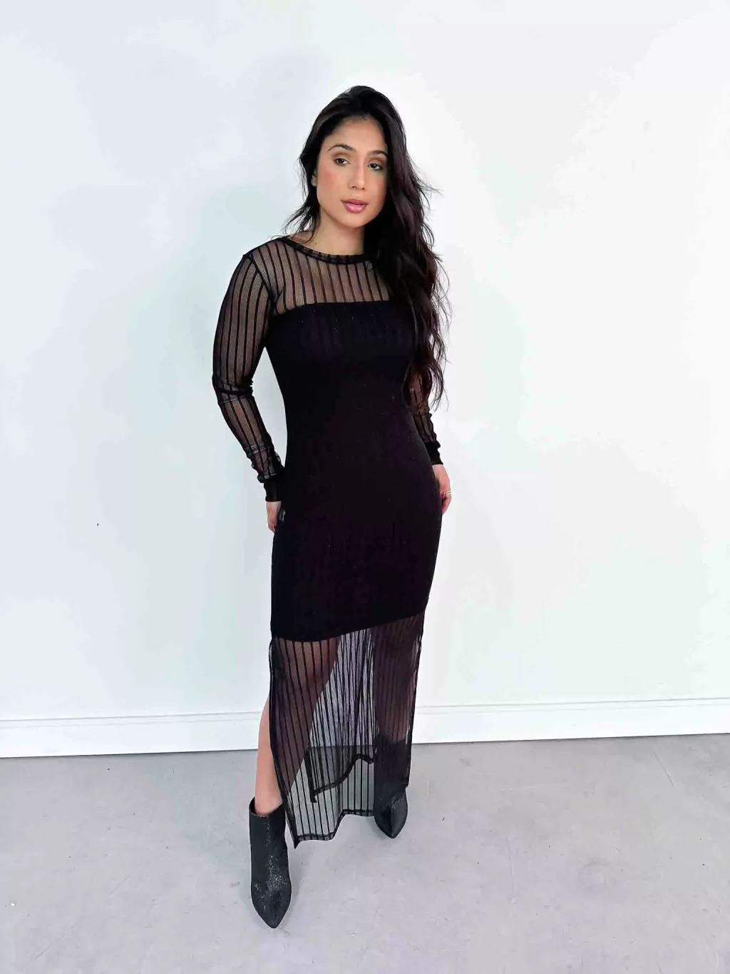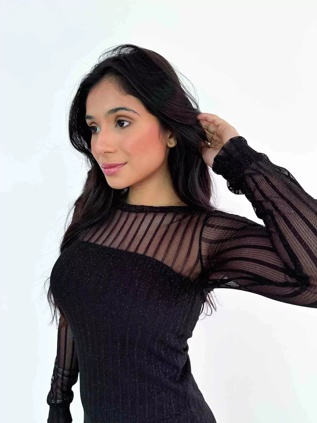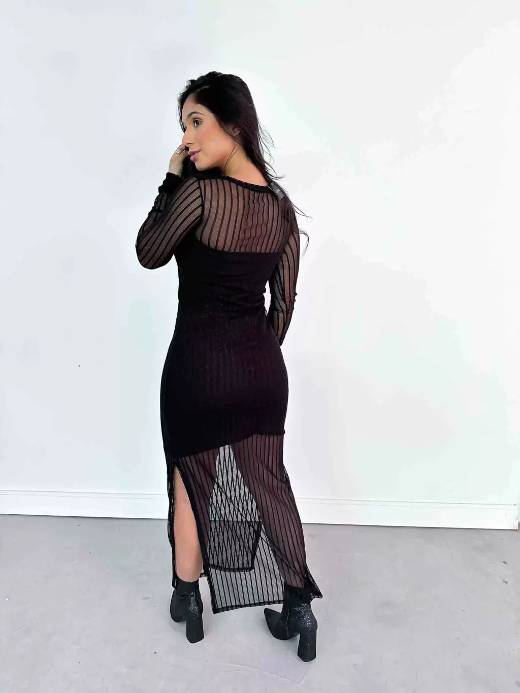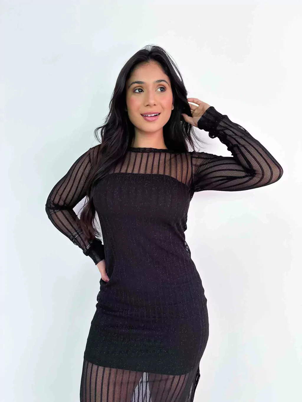Descubra a elegância e o charme do nosso Vestido Midi em Tule Preto com Risca e Manga Longa. Este modelo sofisticado combina a delicadeza do tule com um design moderno e versátil, perfeito para diversas ocasiões.